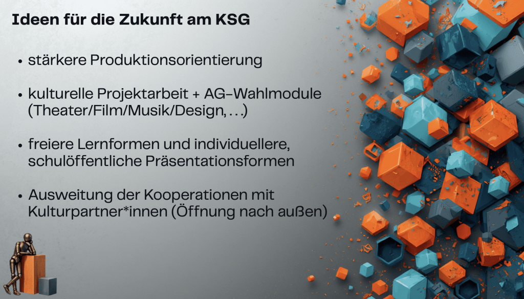 Im anschließenden Teil präsentierte die Planungsgruppe zentrale Inhalte des neuen Schulkonzepts sowie die geplante Öffnung in die Stadt. Ein besonderer Schwerpunkt liege dabei auf dem kulturellen Profil der Schule, sich nicht nur im AG-Angebot am Nachmittag zeigen soll, sondern auch in der Entwicklung des Faches MuKuBi (Musisch-Kulturelle Bildung), so Thorsten Meyer von der Planungsgruppe.
